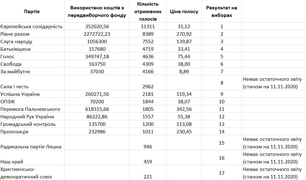 Відповідно до Виборчого кодексу остаточні фінансові звіти мали б бути подані до ТВК до 1 листопада. Станом на 11 листопада у відкритому доступі є інформація про звіти 13 із 17 партій та 10 з 16 кандидатів на посаду міського голови.