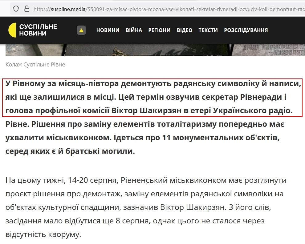В Рівному за місяць-півтора демонтують радянську символіку й написи, які ще залишилися в місті. Цей термін озвучив секретар Рівнеради і голова профільної комісії Віктор Шакирзян в етері «Українського радіо. Рівне» 9 серпня 2023 року.