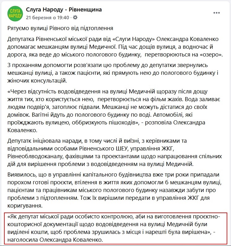 Депутатка Рівненської міської ради від «Слуги Народу» Олександра Коваленко допомагає мешканцям вулиці Медичної. Під час дощів вулиця, а водночас й дорога, яка веде до міського пологового будинку, перетворюються на «озеро».