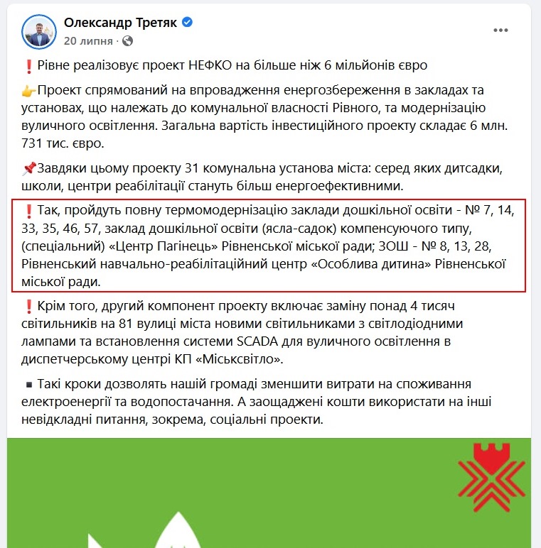 На своїй сторінці у Фейсбуці Олександр Третяк повідомив, що Рівне реалізовує проєкт НЕФКО на більше ніж 6 мільйонів євро.